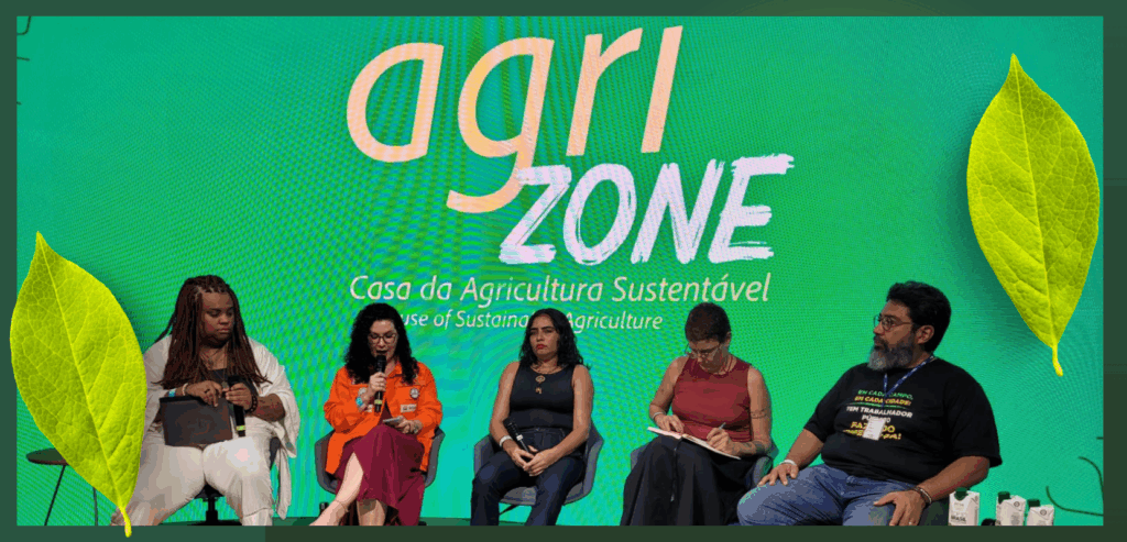 Na manhã desta terça-feira (12), o SINPAF coordenou uma mesa de debate na AgriZone, a Casa da Agricultura Sustentável na COP30, em Belém, PA. Com mediação do presidente do Sindicato, Jean Kleber, o debate contou com a presença de quatro mulheres líderes de diferentes áreas que compartilharam o mesmo propósito: defender o meio ambiente e as(os) trabalhadoras(es).