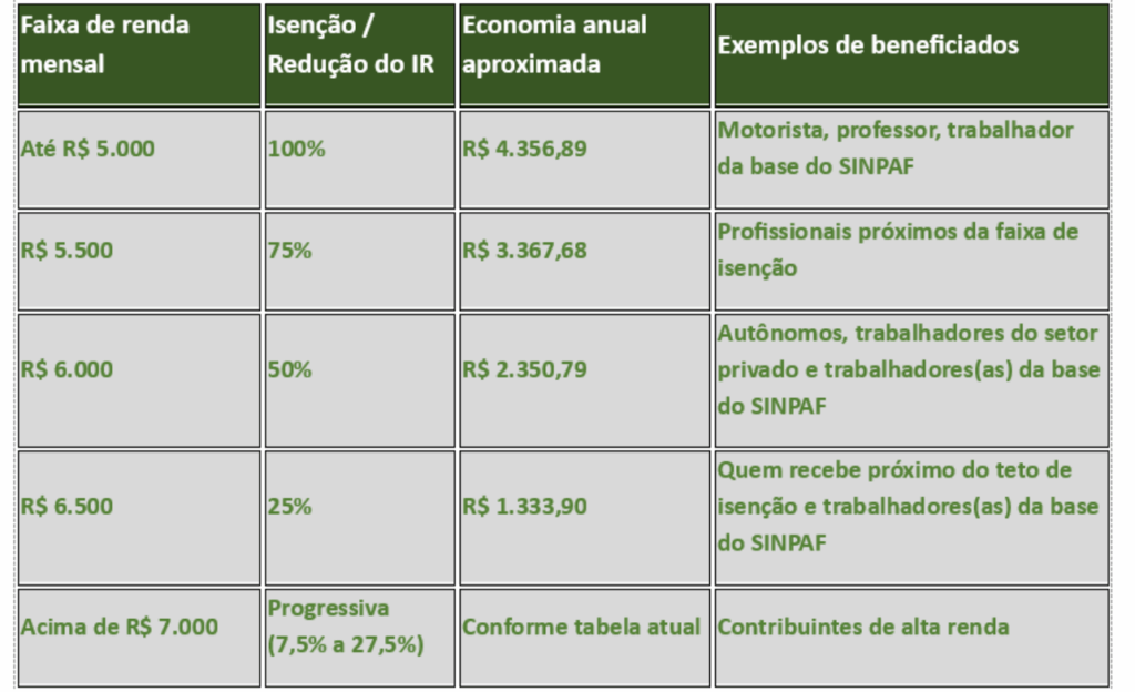 - As alíquotas progressivas permanecem as mesmas para rendas acima de R$ 7 mil.